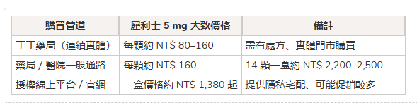 對比 20 mg 劑量版本,丁丁藥局所列的 5 mg 盒價約 NT$ 1,480 為例,每顆約 NT$ 148。