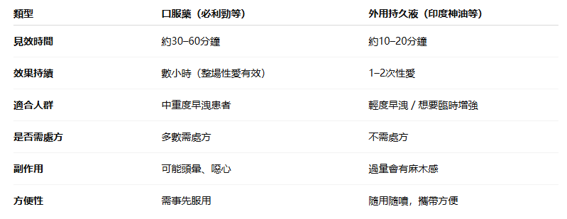 如果你是 長期早洩、影響性生活品質 → 口服藥(如必利勁)效果更持久穩定。