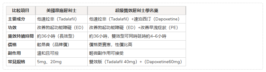 若同時有「早洩」問題,印度的 雙效犀利士(Tadalafil + Dapoxetine) 會是更全面的選擇。